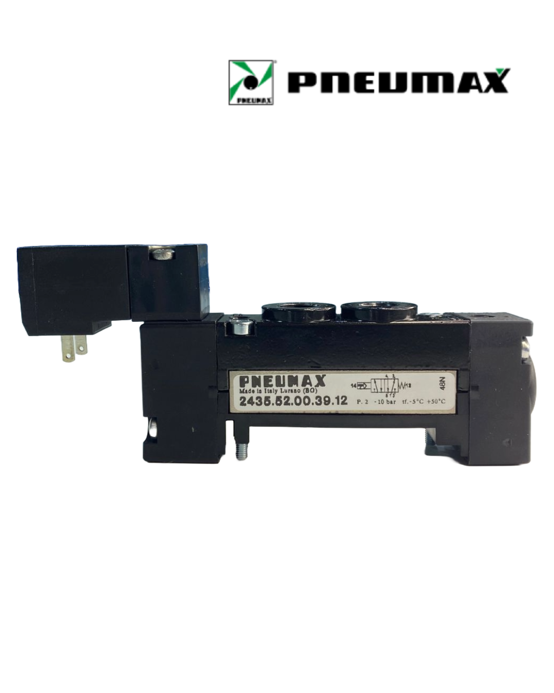 A válvula 2435.52.00.39.12 da Pneumax é uma válvula pneumática de 5 vias e 2 posições, com duplo solenóide e base integrada, oferecendo praticidade na instalação e alto desempenho em aplicações industriais.